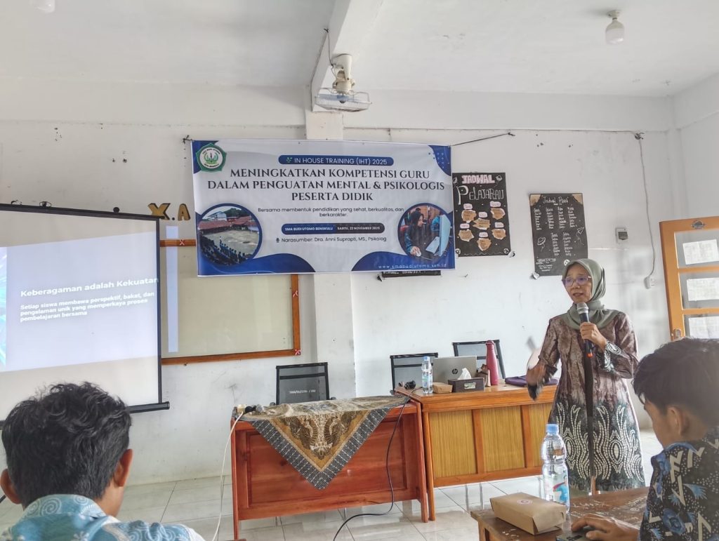 Bengkulu — SMA Budi Utomo Kota Bengkulu menyelenggarakan kegiatan In House Training (IHT) Tahun 2025 dengan fokus pada Peningkatan Kompetensi Guru dalam Penguatan Mental dan Psikologis Peserta Didik. Kegiatan ini digelar pada Sabtu, 22 November 2025, bertempat di Aula SMA Budi Utomo dan diikuti oleh 22 pendidik dan tenaga kependidikan.